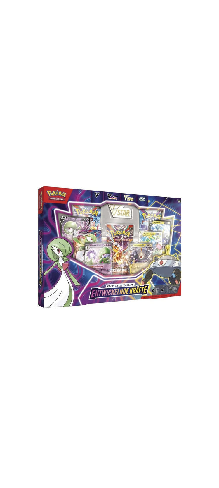 Sprenge alle Grenzen mit Magnetilo und Trasla in der Premium-Kollektion Entwickelnde Kräfte des Pokémon-Sammelkartenspiels! Diese zwei Pokémon treten dir in dieser Box voller mächtiger Karten kampfbereit zur Seite. Schlage dich erfolgreich und sie können sich bis zu Magnezone und Guardevoir entwickeln – als Pokémon-ex! Wenn das noch nicht genug Entwicklungspower ist, kannst du dich auch mit Magnezone-V und Guardevoir-V ins Getümmel stürzen, die sich zu Magnezone-VSTAR und Guardevoir-VMAX entwickeln können. Damit ist es noch nicht vorbei, denn zusätzlich erhältst du sieben Pokémon-Sammelkartenspiel-Booster Packs, um diese vielfältige und exzellente Truppe weiter abzurunden.