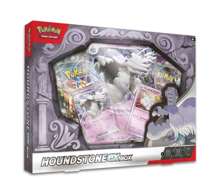 Houndstone sieht vielleicht furchterregend aus, aber wenn Sie sich mit ihm anfreunden, werden Sie für immer einen treuen Kumpel haben! Mit diesem Set erhalten Sie eine Folien-Promokarte mit Houndstone als mächtigem Pokémon-Ex sowie eine Folienkarte mit Greavard, sodass Sie beide Ghost Dog-Pokémon zu Ihrem Deck oder Ihrer Sammlung hinzufügen können. Und Sie finden noch mehr Pokémon-Partner in den mitgelieferten Pokémon TCG-Booster Packs!